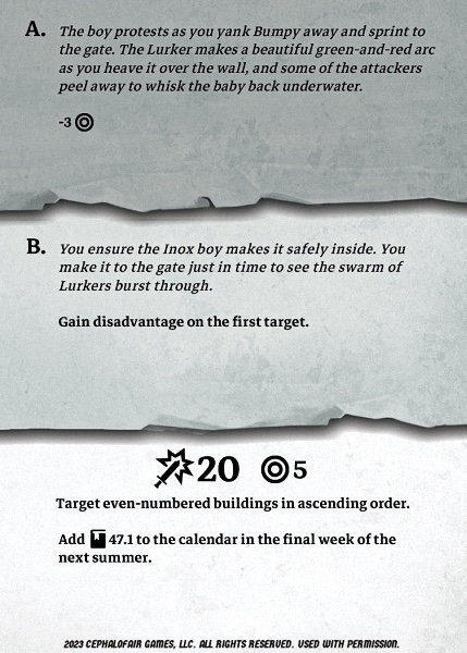 - | Daredevil | 15 | 8 | 15 | 114 | 3 | 5 | 0 | 0 | -6 | 14 | 1 | 1 | 3 | 1 | 1 | 3 | 2 | 1 | Buy for 4 gold. Pay 2 gold for town's . | ||||||||||||||