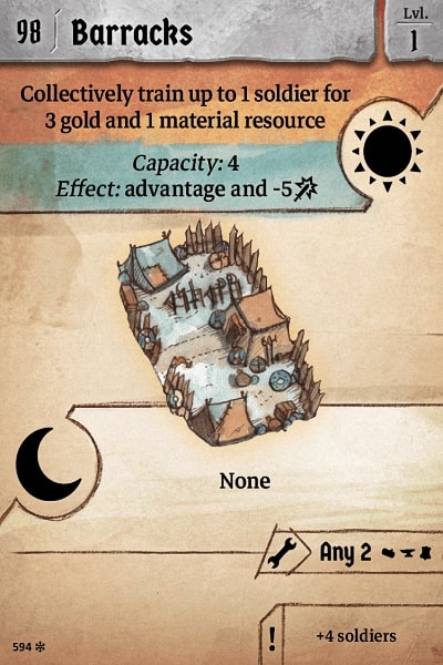Collectively train up to 1 soldier for 3 gold and 1 material resource. Capacity: 4.