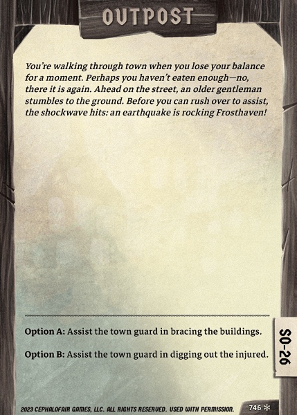 Prepper | 9 | 8 | 2 | 5 | 24 | 1 | 10 | 7 | 21 | 3 | 0 | 24 | 1 | 3 | 1 | 4 | 2 | Gained Unhealthy Potion from city already after scenario 32. One of the loots was the first entry of loot card 1418 (section 43.4): Old Coin worth (L+1) gold = 3 gold. | ||||||||||||||||