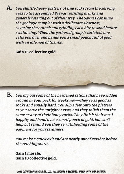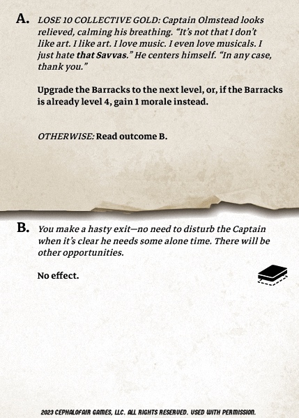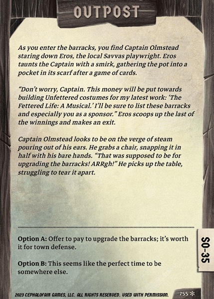 - | Straggler | 14 | 8 | 2 | 0 | 65 | 2 | 3 | 1 | 3 | 5 | 4 | -5 | 28 | 1 | 1 | 0 | 0 | 7 | Mastery 1 done. Gain 4 gold from SRE-10. Gain Tri-Corner Hat (195, scenario reward). Gain 5 gold for reward. Pay 5 gold for the Jeweler. | ||||||||||||||