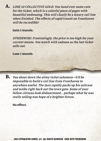- | Hunter | 9 | 6 | 62 | 2 | 3 | 5 | 10 | -5 | -2 | 12 | 1-1 | 7 | 2 | 1 | Paid for railroad ticket: 5g. Paid for Mining Camp: M, 1 gold. Paid for lumber: 1 gold. | ||||||||||||||||||