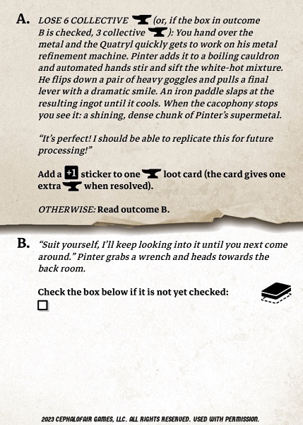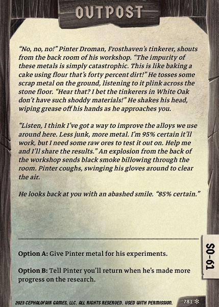 - | Wastrel | 13 | 14 | 2 | 468 | 8 | 1 | 0 | 0 | -24 | 54 | 1 | 4 | 4 | 2 | Pay 24 gold for resources. Distill Major Healing Potion (roc), Vigor Potion (arr), Expertise Potion (roc), Plague Flask (axe). Retire (12 challenges). | ||||||||||||||||||