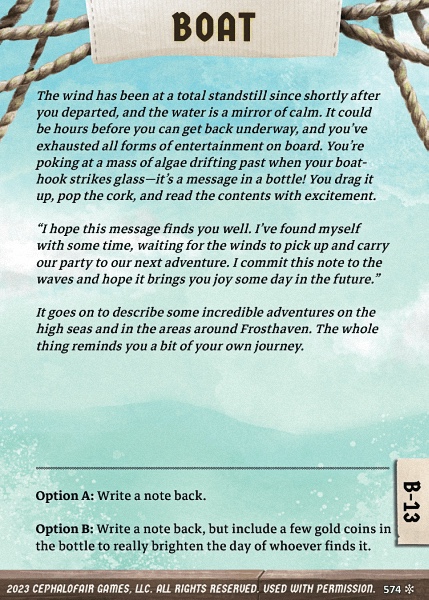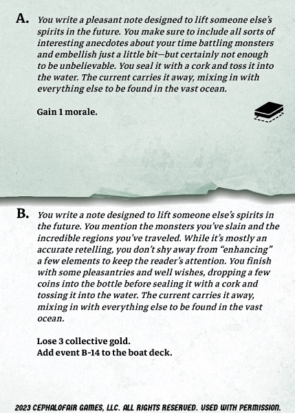 Dawdler | 12 | 10 | 2 | 267 | 5 | 2 | 1 | 3 | 30 | -3 | -16 | 140 | 1 | -1 | -1 | 7 | 3 | 5 | Lose 3 gold to boat event. Spend 6g to train two soldiers. Spend 10g for 5 . Brew Major Power Potion. | |||||||||||||||