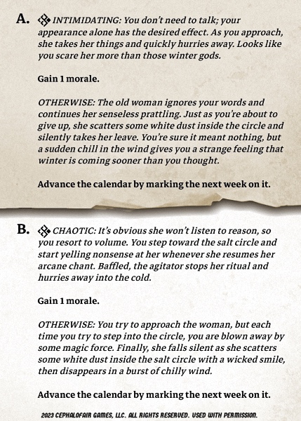 - | Vanguard | 8 | 6 | 97 | 3 | 4 | 0 | 0 | -6 | 0 | 1-3 | 1-1 | 1-1 | 1-1 | 5 | 1 | 2 | Paid for soldier: 3g. Paid for resources: 3g. Brew Power Potion (Arr, Axe), gift to Roamin. RETIRE: 5 different herbs looted (A Study of Plants). 3 lumber, 1 hide to town supply. | ||||||||||||||||